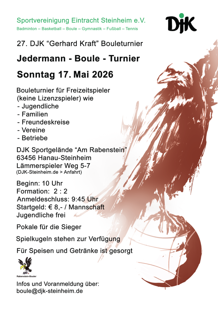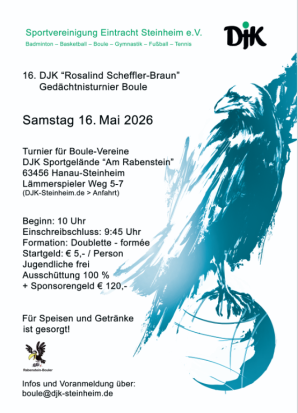 Wie jedes Jahr hatte der PC Gründau zur Eröffnung der Freiluftsaison am 6.4.26 zum Oster-Bouleturnier geladen. Der Einladung waren neben 102 weiteren Boulespielern auch 10 Rabensteiner gefolgt. Bei herrlichem Frühlingswetter und spannenden Spielen wiederholten Laura Becker und Nicho Mari aus Mechenhard ihren ihren Vorjahressieg. Auf das Siegertreppchen folgten ihnen auf Platz 2 Bernd Lange und Manfred Schaffer von der DJK Steinheim und auf Platz 3 - ebenfalls aus Steinheim - Mladen Lehmann und Kai Fischer. Herzlichen Glückwunsch.